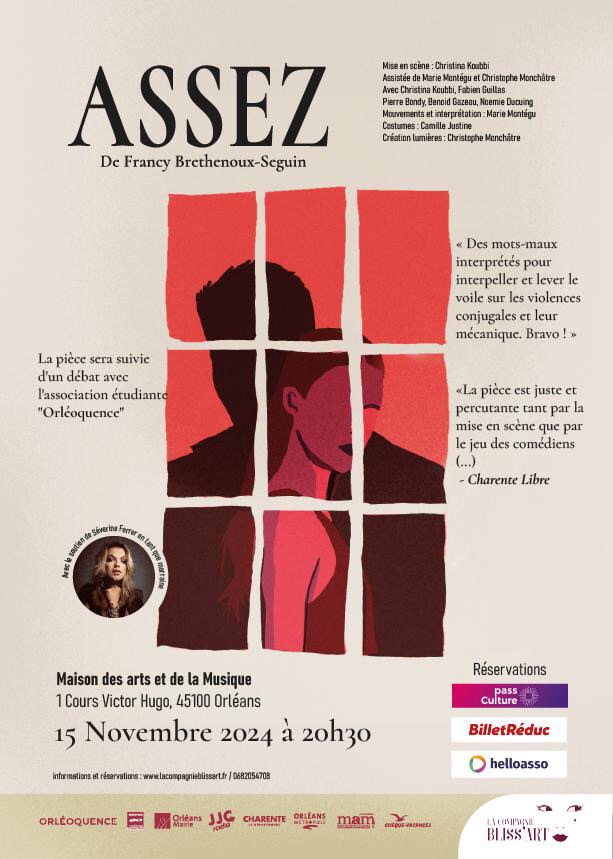 À noter sur vos agendas ! « ASSEZ » la dernière création de la compagnie Bliss’Art, une pièce de Francy Brethenoux-Seguin et parrainée par Séverine Ferrer, à la Maison des Arts et de la Musique, 1 cours Victor Hugo 45100 Orléans – vendredi 15 novembre 2024 à 20h30.