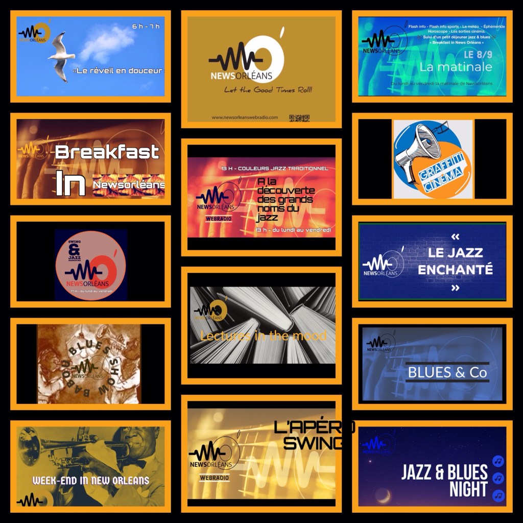 8 h : Le flash infos et le flash infos sports, La météo, l’éphéméride, l’horoscope, les sorties cinéma, Dans le cadre d’une programmation musicale pour cette matinale radio. Pour clôturer La matinale, un grand RDV : « BREAKFAST IN NEWS ORLEANS » du jazz et du blues pour accompagner votre petit déjeuner. Entre 13 h et 14 h : le flash info et le flash info sports – les sorties cinéma – la chronique : Une date dans l’histoire. Suivi par « Couleurs Jazz Traditionnel » à la découverte ou redécouverte des grands noms du jazz, A 17 h : Jazz au goûter avec « Swing et Jazz Manouche », pour découvrir ou redécouvrir ce jazz si attachant. À 18 h : le flash info, le flash info sport, la chronique : Le Buzz du jour. A 20 h : « Le Jazz Enchanté » une séquence de jazz vocal. À 21 h : « Blues & Co » des standards du blues aux dernières nouveautés. Les émissions thématiques Mardi 7 octobre – 18 h : « Babou Blues Show » Mercredi 8 octobre : à 15 h : « Graffiti Cinéma »et à suivre, les sorties cinéma jeudi 9 octobre – 18 h : «Lectures in the Mood » Les incontournables RDV du Week-end Le samedi et le dimanche : A 11 h : « Week-end in New Orleans ». De 18 h à 20 h : « L’Apéro Swing » De 22 h à 00h : «Jazz & Blues Night – le Grand RDV de la nuit » Diffusion : sur http://www.newsorleanswebradio.com – sur l’application News Orléans Webradio (Android ou IOS) et sur les plateformes : Online Radio Box – my Tuner – Welove.radio – Orange Radio – Radioline – Airable (Deezer) – Phonostar. Très belle semaine sur News Orléans Webradio !