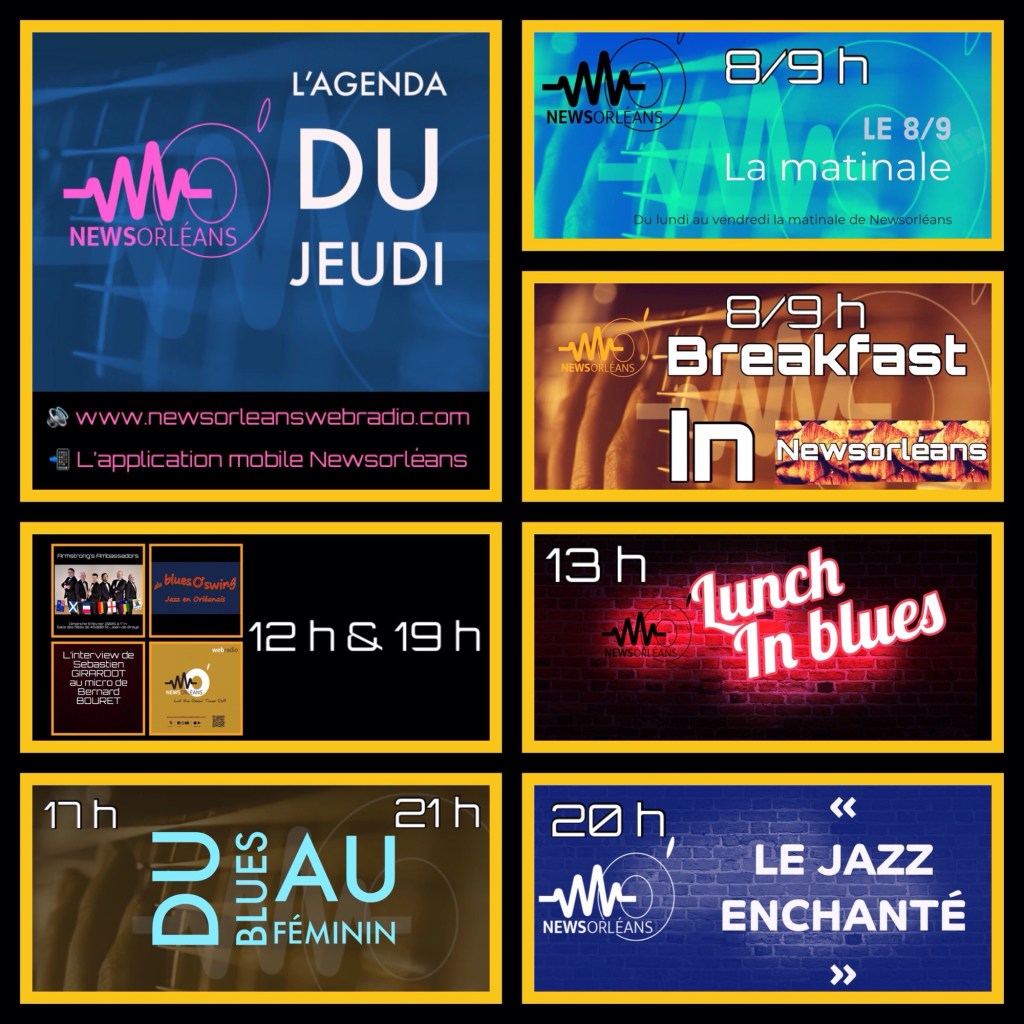 8 h : Le flash infos et le flash infos sports, La météo, l’éphéméride, l’horoscope, les sorties cinéma, Dans le cadre d’une programmation musicale pour cette matinale radio. Pour clôturer La matinale, un grand RDV : « BREAKFAST IN NEWS ORLEANS » du jazz et du blues pour accompagner votre petit déjeuner. Entre 13 h et 14 h : le flash info et le flash info sports – les sorties cinéma – la chronique : Une date dans l’histoire. Suivi par « Couleurs Jazz Traditionnel » à la découverte ou redécouverte des grands noms du jazz, A 17 h : Jazz au goûter avec « Swing et Jazz Manouche », pour découvrir ou redécouvrir ce jazz si attachant. À 18 h : le flash info, le flash info sport, la chronique : Le Buzz du jour. A 20 h : « Le Jazz Enchanté » une séquence de jazz vocal. À 21 h : « Blues & Co » des standards du blues aux dernières nouveautés. Les émissions thématiques Mardi 7 octobre – 18 h : « Babou Blues Show » Mercredi 8 octobre : à 15 h : « Graffiti Cinéma »et à suivre, les sorties cinéma jeudi 9 octobre – 18 h : «Lectures in the Mood » Les incontournables RDV du Week-end Le samedi et le dimanche : A 11 h : « Week-end in New Orleans ». De 18 h à 20 h : « L’Apéro Swing » De 22 h à 00h : «Jazz & Blues Night – le Grand RDV de la nuit » Diffusion : sur http://www.newsorleanswebradio.com – sur l’application News Orléans Webradio (Android ou IOS) et sur les plateformes : Online Radio Box – my Tuner – Welove.radio – Orange Radio – Radioline – Airable (Deezer) – Phonostar. Très belle semaine sur News Orléans Webradio !