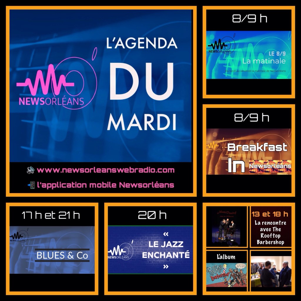 8 h : Le flash infos et le flash infos sports, La météo, l’éphéméride, l’horoscope, les sorties cinéma, Dans le cadre d’une programmation musicale pour cette matinale radio. Pour clôturer La matinale, un grand RDV : « BREAKFAST IN NEWS ORLEANS » du jazz et du blues pour accompagner votre petit déjeuner. Entre 13 h et 14 h : le flash info et le flash info sports – les sorties cinéma – la chronique : Une date dans l’histoire. Suivi par « Couleurs Jazz Traditionnel » à la découverte ou redécouverte des grands noms du jazz, A 17 h : Jazz au goûter avec « Swing et Jazz Manouche », pour découvrir ou redécouvrir ce jazz si attachant. À 18 h : le flash info, le flash info sport, la chronique : Le Buzz du jour. A 20 h : « Le Jazz Enchanté » une séquence de jazz vocal. À 21 h : « Blues & Co » des standards du blues aux dernières nouveautés. Les émissions thématiques Mardi 7 octobre – 18 h : « Babou Blues Show » Mercredi 8 octobre : à 15 h : « Graffiti Cinéma »et à suivre, les sorties cinéma jeudi 9 octobre – 18 h : «Lectures in the Mood » Les incontournables RDV du Week-end Le samedi et le dimanche : A 11 h : « Week-end in New Orleans ». De 18 h à 20 h : « L’Apéro Swing » De 22 h à 00h : «Jazz & Blues Night – le Grand RDV de la nuit » Diffusion : sur http://www.newsorleanswebradio.com – sur l’application News Orléans Webradio (Android ou IOS) et sur les plateformes : Online Radio Box – my Tuner – Welove.radio – Orange Radio – Radioline – Airable (Deezer) – Phonostar. Très belle semaine sur News Orléans Webradio !